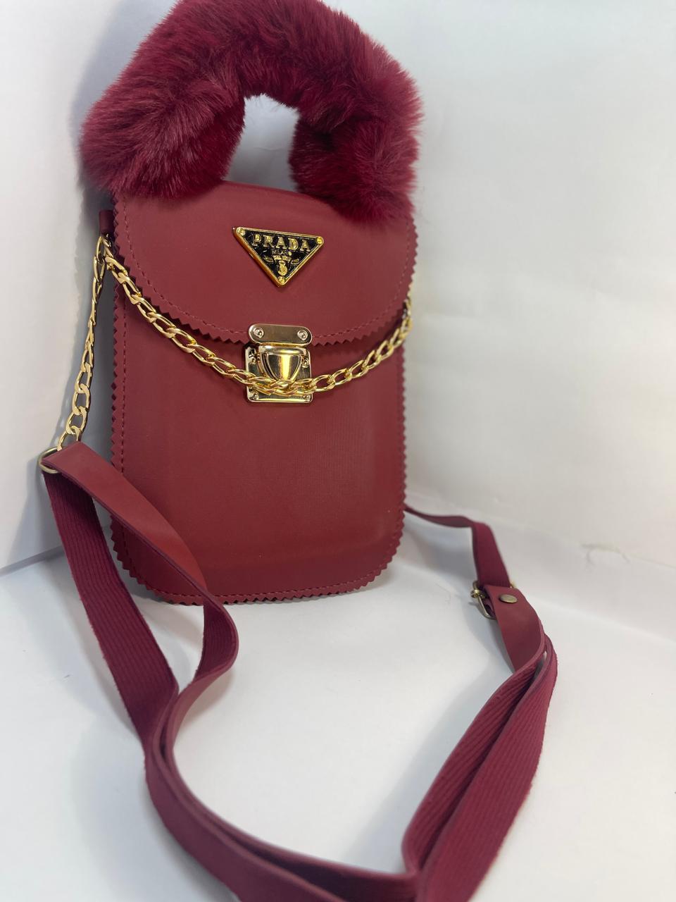 "Luxury Red Prada Handbag with Furry Handle and Gold Chain"